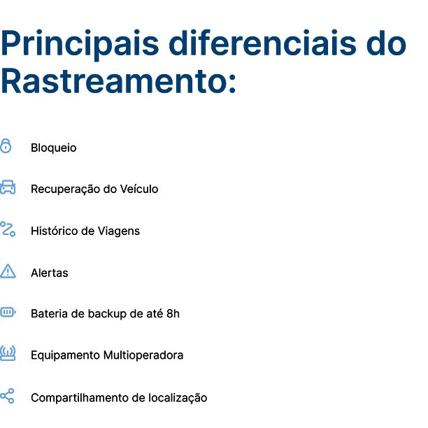 Geolocalização dos veículos; Endereço e data de cada localização. Histórico de eventos. Distância percorrida. Excesso de velocidade. Cercas virtuais. Alertas.